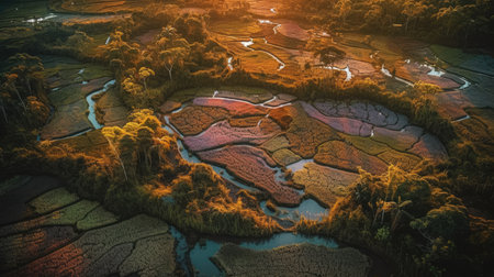 Beautiful aerial view of rice fields in the countryside at sunset.