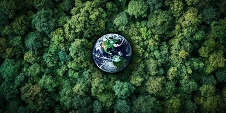 A beautiful Earth globe surrounded by a lush forest canopy, symbolizing global conservation efforts.