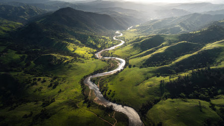 Rolling green hills stretch across the landscape, with gentle mountains rising in the distance under soft morning light, showing natures serenity.