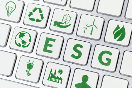 ESG or environmental social governance. Managing a company with a nature conservation strategy. Icons on the keyboard