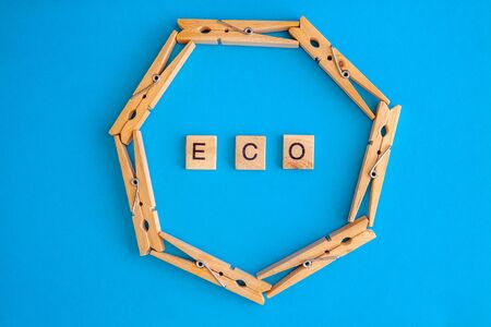 Wooden clothespins are scattered on a white and blue background with the words eco and natural. View from above. Copy space. Flat lay. The concept is natural, eco-friendly.
