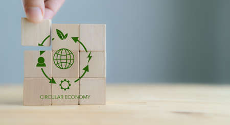 Circular economy concept, recycle, environment, reuse, manufacturing, waste, consumer, resource. Sustainable development. Hand put wooden cubes; the symbols of circular economy on grey background.