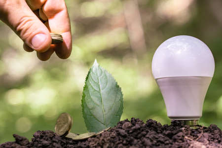 A man throws coins on a combination of lamps and postcards with a hand. saving energy concept