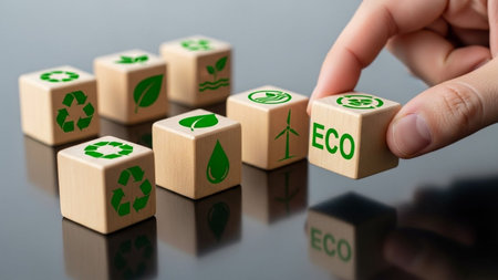 Ecology concept. Hand of a businesswoman arranging wooden cubes with green eco symbols.