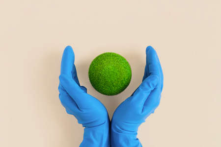 Theme of earth day. Green planet earth, held by hands in gloves. Caring for the climate, nature, ecology. Flat lay for websites, magazines, apps. Hands holding globe on a beige background