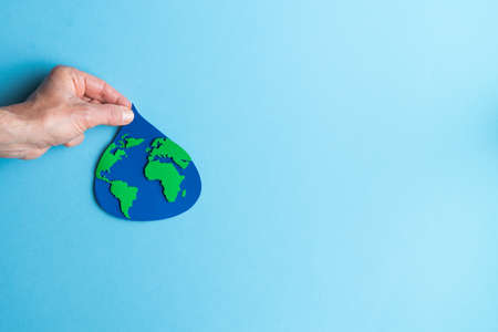 Hand holding a water drop cut out of paper with world map inside on blue background. Copy space.