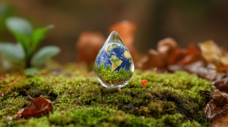 Earth miniaturized inside a clear droplet on a mossy surface, emphasizing climate consciousness