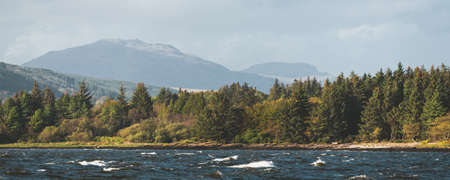 Woodland, hills and mountains near Firth of Clyde river, a view from a sailing boat. Dramatic sky after the storm. Scotland, UK. Travel destinations, eco tourism, pure nature. Atmospheric landscape