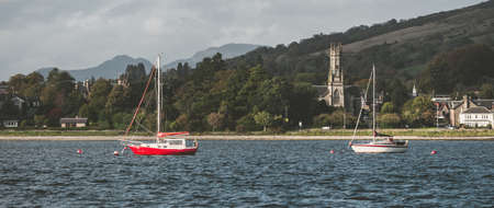 Small sailboats anchored on mooring near the shores of Firth of Clyde. Rhu, Scotland, UK. Old church in the background. Dramatic stormy sky. Sailing, sport, recreation, tourism, travel destinations