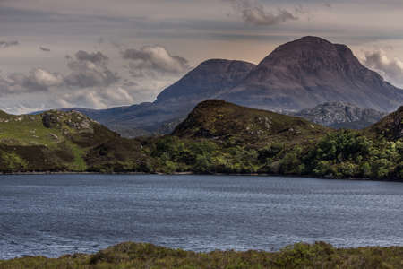 Assynt Peninsula, Scotland - June 7, 2012: Two brown mountain peaks under heavy brownish skies fronted by green wild rough slopes east of Loch Buine Moire. Lake waters in front.