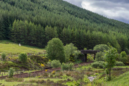 Bridge of Orchy, Scotland, UK - June 12, 2012: Green forested hill and brown rusty train track drawing aline under small bridge near Loch Tulla. Some yellow flowers.