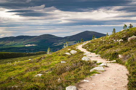 Hiking trail near Aviemore in Scottish Highlands with Cairngorms peaks on the horizon. Scenic summer landscape.