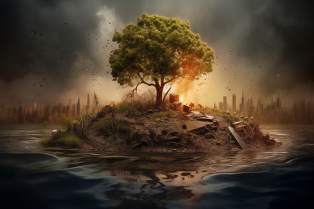 A small, tranquil island adorned with a lone tree, providing a peaceful retreat surrounded by still waters, Pollution of the environment, Concept of environmental pollution, AI Generated