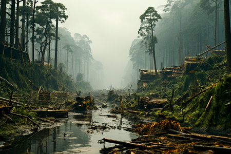 Clear-cut trees and muddy ground depict extensive deforestation in a wooded area. The early morning sky reveals clouds and sunlight filtering through the trees, highlighting the destruction.