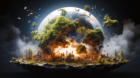 A small tree sprouts from a cracked Earth globe, engulfed in smoke and debris, symbolizing the resilience of nature amidst environmental devastation.