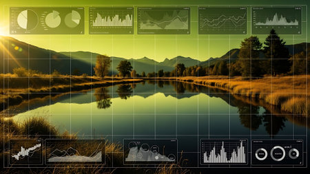 A peaceful lake scene with mountains and trees reflected in the water, overlaid with a futuristic digital interface.