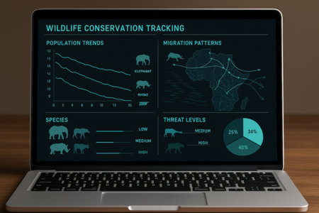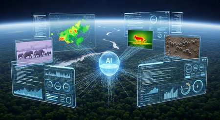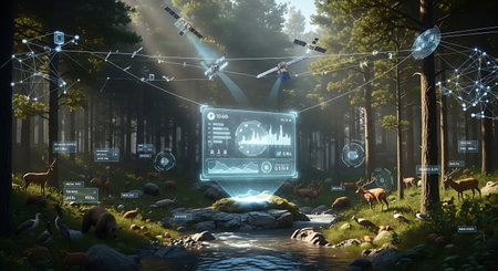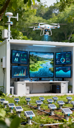 A remote monitoring station displays data from multiple drones conducting environmental surveys over a forest area focusing on wildlife conservation efforts