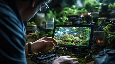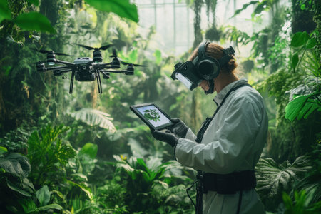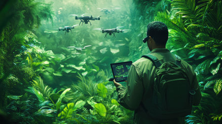In a thriving futuristic jungle, a conservationist tracks wildlife with drones, ensuring ecological balance and protection of the habitat.