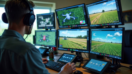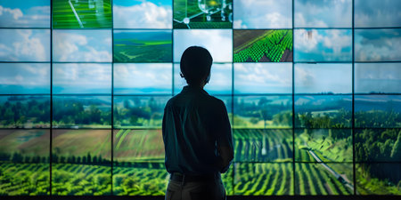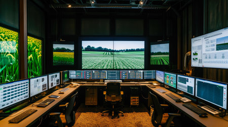 A person in a control center overseeing different aspects of a smart farm like irrigation and pest control. Concept Smart Farm Technology, Control Center Operations, Irrigation Systems