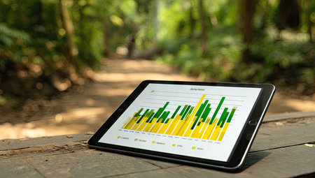 A tablet computer displaying a colorful bar chart is positioned on a wooden surface outdoors. The background is a blurred natural scene with green foliage and a path. The lighting is natural and soft, highlighting the tablet's display. This image is suitable for a variety of editorial and commercial uses.