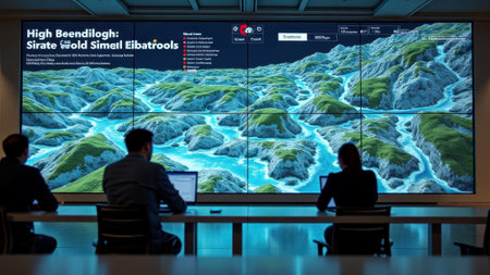 Team analyzing 3d terrain simulation on large digital screen in modern conference room. That the image is generated using AI.