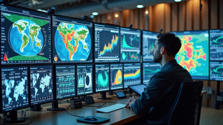 A dedicated meteorologist works intently in a high-tech control room filled with multiple screens displaying hurricane data and environmental maps.