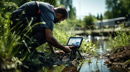 An environmental scientist in protective gear collects a water sample from a riverbank, focusing on assessing pollution levels and ensuring ecosystem health.