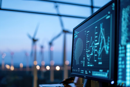Detailed data visualization showcasing wind turbine metrics and analytics on a monitor, illustrating renewable energy solutions and performance insights.