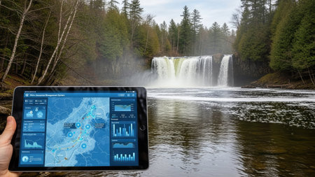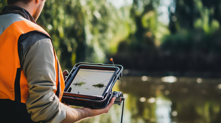A person in safety gear uses a tablet to assess water conditions by the river surrounded by greenery on a sunny day.