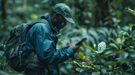 A traveler uses a mobile application on their smartphone to identify a tropical plant while exploring a dense, verdant jungle.