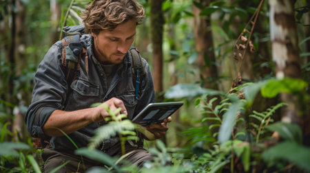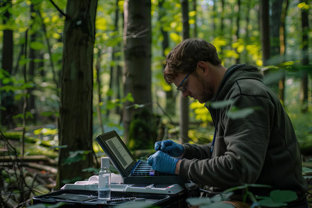 A biologist using a portable genetic sequencer to analyze DNA samples in the middle of a forest