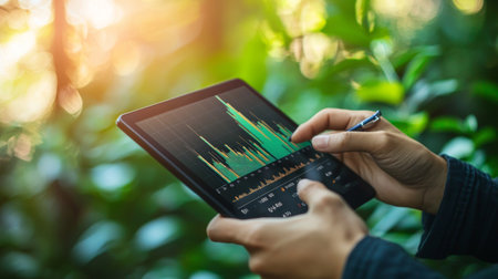 Close-up of hands holding a tablet displaying financial stock market data, with a background of green leaves and natural light, symbolizing eco-friendly finance and technology.