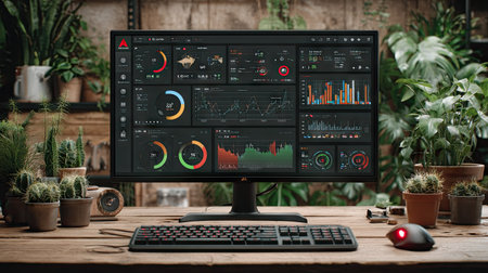 A computer monitor showcases complex data visualizations, possibly financial or scientific. The screen is centrally positioned on a wooden desk, with a keyboard and mouse nearby. Lush green plants and natural light create a balanced composition. The image could serve purposes related to technology, data, or design.