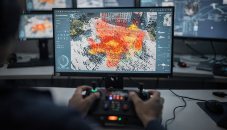 A medium shot showing a drones live feed screen displaying crowd density with the operators hands in soft focus in the foreground