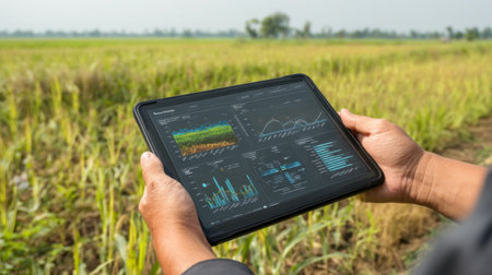 A farmer engages with a tablet displaying detailed agricultural data while standing in a vibrant rice field, showcasing modern farming techniques.