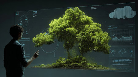 Environmental technology concept with person analyzing green tree and data charts, showing innovation and sustainability in nature protection