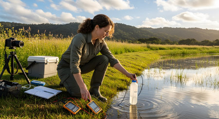 A female biologist is kneeling by a pond in a grassy, hilly landscape, collecting water samples in a bottle. Scientific equipment like a camera on a tripod and meters are nearby, conveying a sense of field research, environmental science, and data collection.
