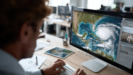 A professional engaged in analyzing hurricane data on a computer screen in a modern office. Multiple monitors display detailed weather maps and satellite imagery.