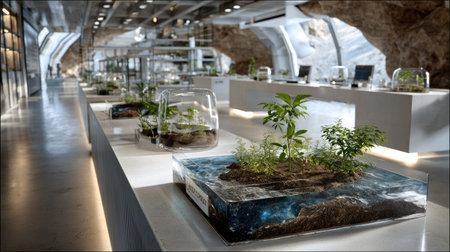 A modern laboratory showcasing innovative hydroponic systems, featuring plants in glass containers illuminated by sleek design. Ideal for projects emphasizing sustainability and technology.