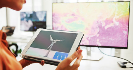 Screen, engineer and employee with tablet, hands and plan for windmill design, online and renewable energy. Office, designer and person with tech for wind turbine, economic benefits and eco friendly