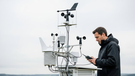 Caucasian male adult using instrument at modern weather station with sensors and anemometers outdoors