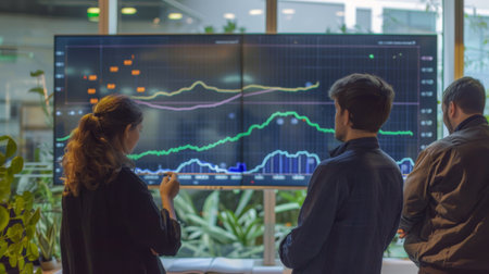 A detailed line graph displayed on a large monitor, with people discussing the data in the background.