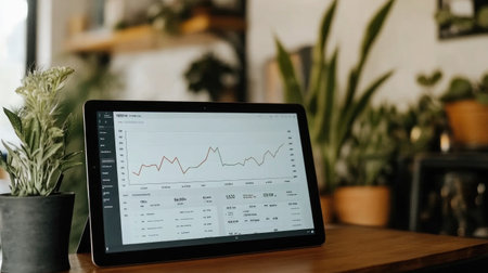 A modern office setting featuring a tablet showcasing financial charts and graphs, complemented by lush indoor plants, creating a productive and inspiring workspace atmosphere.