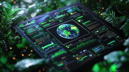 A futuristic digital interface showcases Earth surrounded by lush greenery, integrating technology with nature. Ideal for concepts of innovation and environmental awareness.