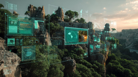 Augmented reality landscape with data overlays and futuristic UI.