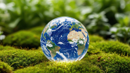 Crystal globe rests on vibrant green moss, symbolizing Earth. globe showcases continents and oceans, reflecting serene and natural environment. This evokes sense of harmony with nature