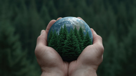 Hands holding earth with lush forest symbolizing environmental conservation.