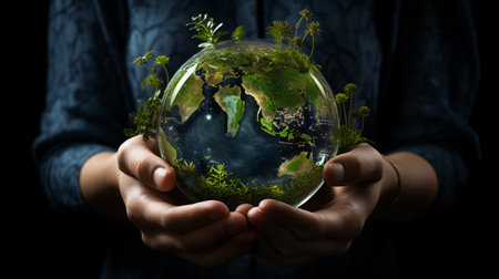 A forceful illustration showing hands clasping a world with luscious vegetation, emphasizing the requirement for worldwide sustainability initiatives.