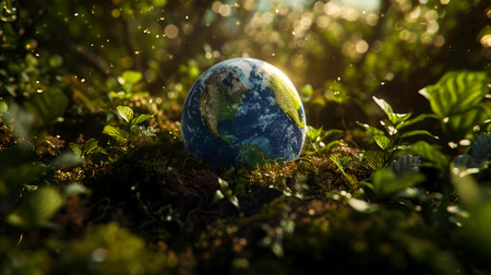 a globe nestled in lush green nature, symbolizing Environment, circular economy, and net-zero initiatives, embodying the concept of sustainable business
