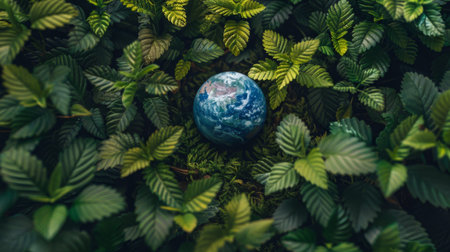 Modern 3D model of a globe surrounded by green foliage, representing global environmental protection with this inviting photo.